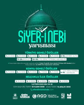 BAŞVURULAR BAŞLADI![]() Anadolu Gençlik Derneği olarak Tüm Türkiyede SİYER-İ NEBİ sınavı yapılacaktır.Selçuklu AGD**MGV olarak Hocacihan Bölgesindeki tüm liselerde bu sunav yapılacaktır. Tüm liseli gençlerimizin Kaybedeni olmayan bu sınava katılmalarını arzu ediyoruz.Sınavda Başarılı olan öğrencilerimiz ödüle doyacaklardır. Anadolu Gençlik Derneği ve Milli Gençlik Vakfı olarak yarışmamıza katılan tüm öğrencilerimize başarılar diliyoruz. Ekrem CEYHAN Durmuş Ali KARA AGD Selçuklu Başkanı AGD / MGV İl Başkanı SINAV BAŞVURU TARİHLERİ ........................................................................................... Başvuru Tarihi :14.10.2025 Son Başvuru Tarihi : 25.11.2025 Sınav Tarihi : 14.12.2025 TÜRKİYE GENELİ ÖDÜLLER ........................................................................................... 1*-25.000.TL 2*-23.000.TL 3*-20.000.TL 4*-18.000.TL 5*-15.000.TL 6***10..Arasına Çeyrek Altın 11**20..Arasına Bisiklet 21**30..Arasına Genç istikbal Dergi Aboneliği .................................................................................... KONYA GENELİ ÖDÜLLERİ ........................................................................................... 1*-15.000.TL 2*-12.500.TL 3*-10.000.TL 4*-7.500.TL 5*-5.000.TL 6**10.Arasına 1.yıl genç istikbal aboneliği ............................................................................................ SELÇUKLU İLÇE ÖDÜLLERİ ............................................................................................. 1*-10.000.TL 2*-8.000.TL 3*-6.000.TL 4*-5.000.TL 5*-4.000.TL .................................................................................... iletişim tlf :0505 894 59 28 |